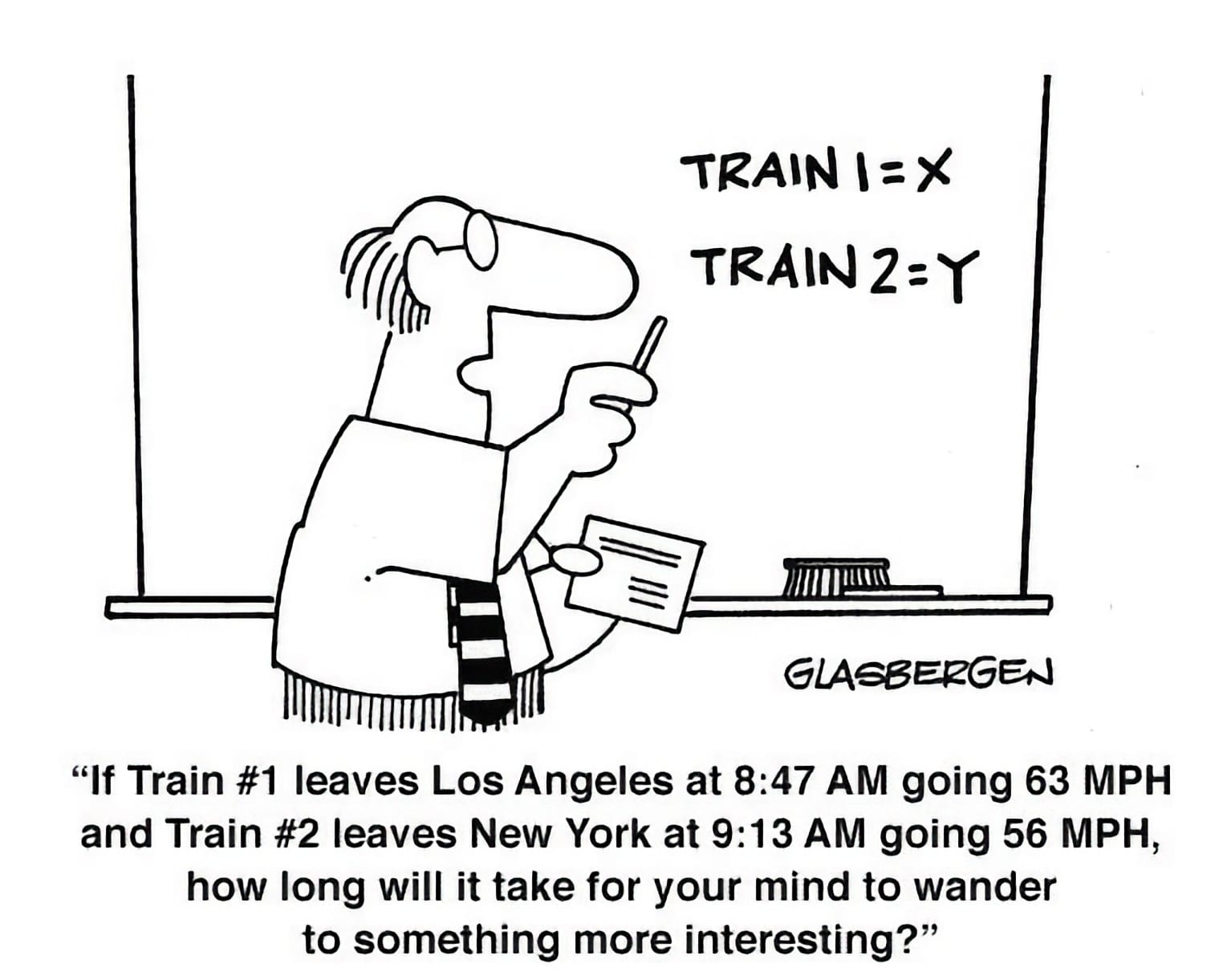 Suddenly, courtesy of the train problem, these young people all get the point of maths and go on to become algebra professors. Or not.