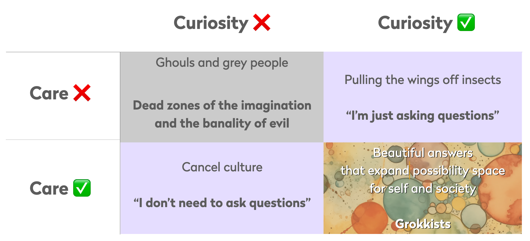 Care without curiosity can express itself as righteous self-assurance that doesn't feel the need to ask questions or enquire further.