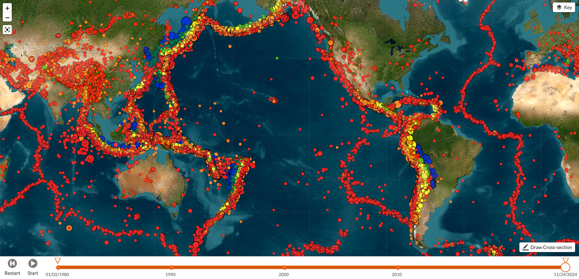 Seismic Explorer is a nifty tool that uses earthquake data (magnitude, depth, location, time) to visualise tectonic activity over time. You can watch earthquakes play out on a map, filter by magnitude, and even overlay tectonic plate boundaries to see how everything connects. One of the best parts is the 3D cross-section feature—just draw a line on the map, and it shows you the depth of earthquakes along that section. I checked out the activity along the Alpine Fault here in New Zealand—it’s incredible to see the seismic patterns in such a geologically active region.