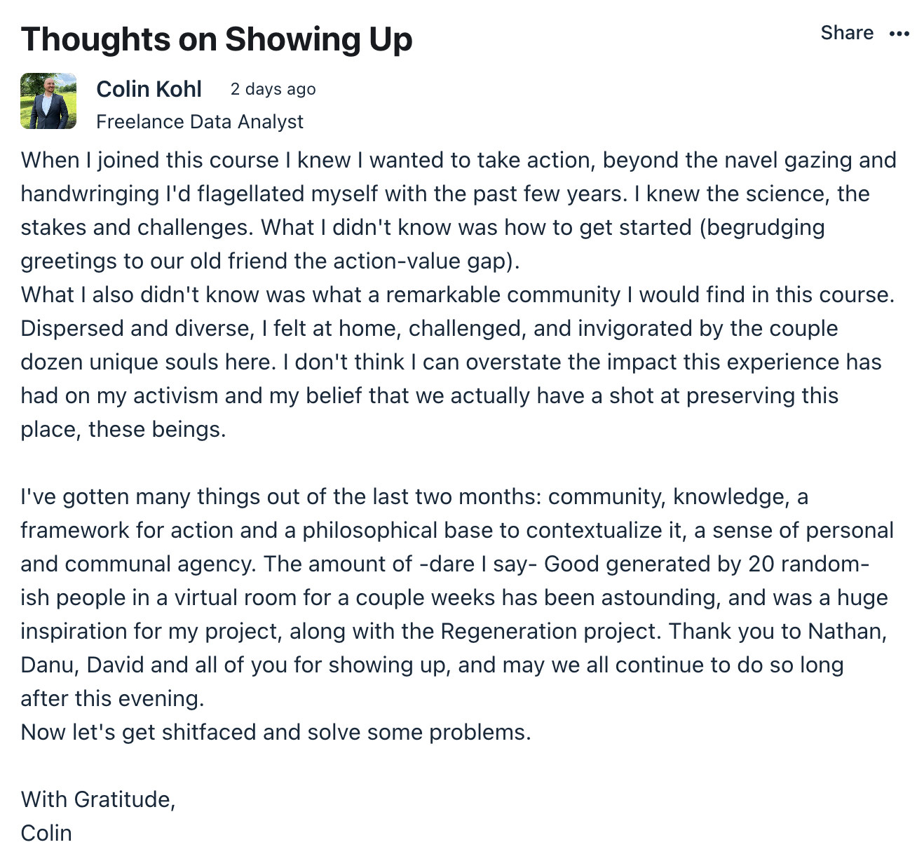 Colin's feedback both encapsulates and surpasses the hopes Nathan and I had in conceptualising this course.