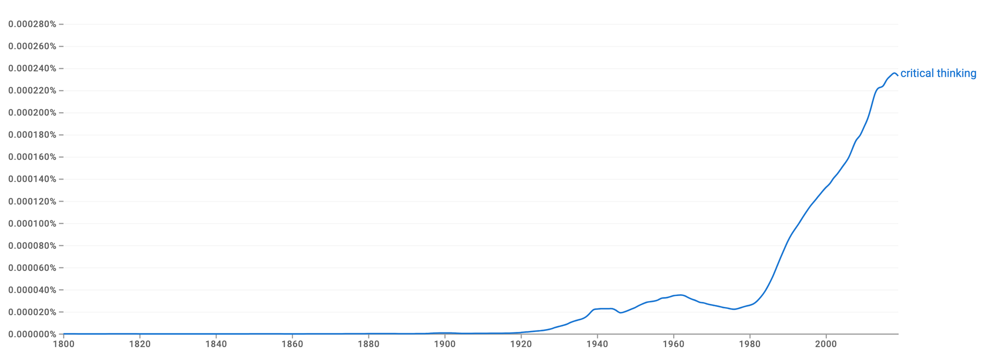 Although it needs to be used with care, the results from Ngram Viewer are, in this case, interesting. They show a surge of references to critical thinking between 1920-40 (in line with Dewey’s influence), a modest growth over the next twenty years (showing the effect of the 1940s study reporting), and then a decline between 1960-1980, at which point exponential growth began.