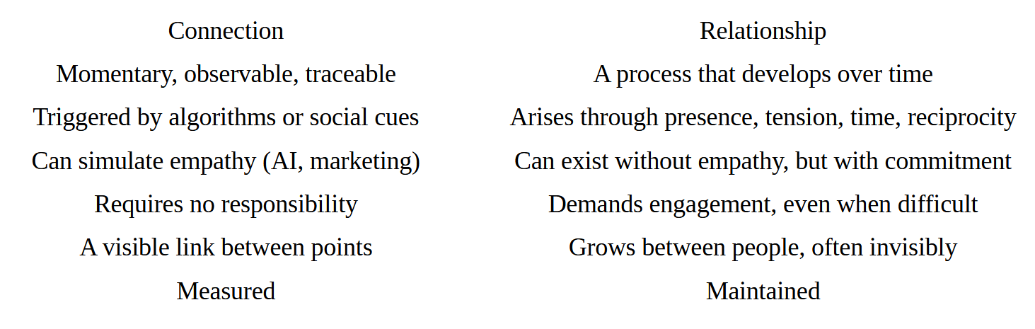 In many conversations — about AI, care, education, communication — it’s assumed that connection equals relationship.