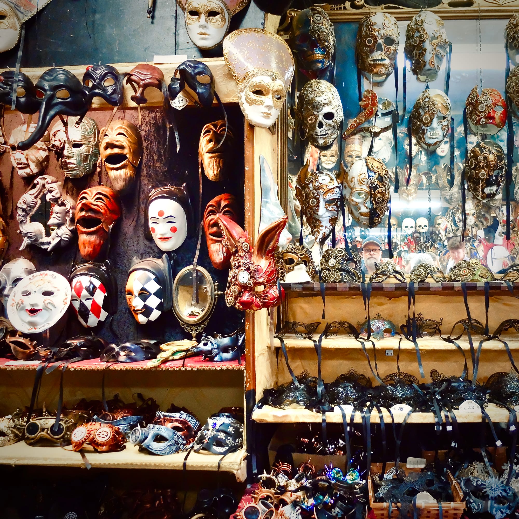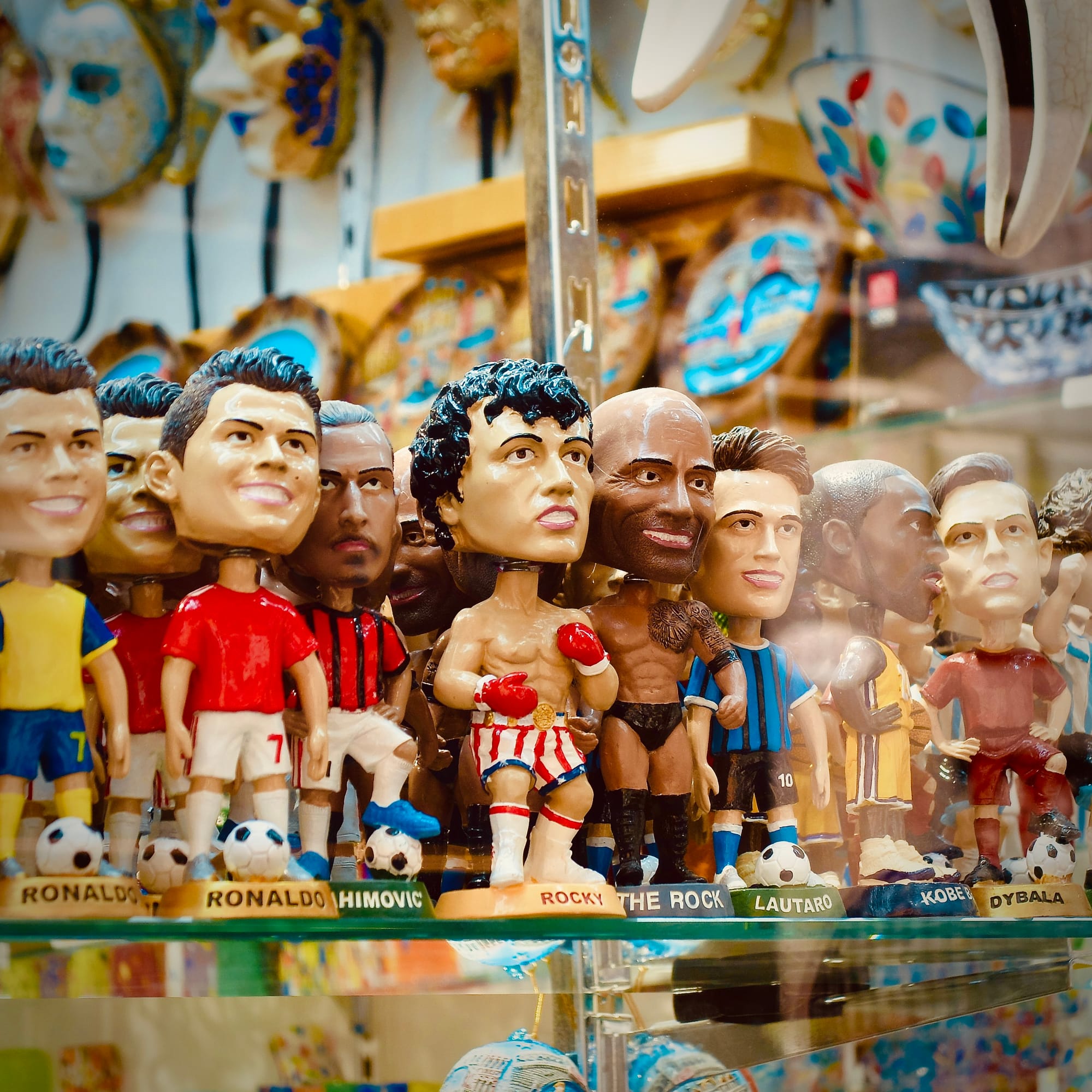 I took a few shots of whatever caught my eye: a discarded Aperol Spritz cap on the edge of a canal, like a still life in orange and stone. Souvenir shops displayed a carnival of grotesque and beautiful masks, some theatrical, some mechanical. There were bobbleheads of Rocky, The Rock, and Ronaldo. All of it surreal and silly and exactly what it should be.