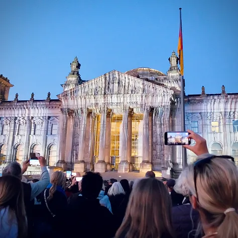 Our last stop was the Reichstag. We were there to see a special projection celebrating the 30th anniversary of Christo and Jeanne-Claude’s Wrapped Reichstag. Back in 1995, the artists had encased the entire building in shimmering silver fabric; now, an animation projected onto the façade made it look as though the wrapping was being peeled away. We arrived 40 minutes early, waited an extra half hour past the scheduled start, and when it finally began, the daylight still lingering in the sky dulled its impact. Beautiful in concept, but fleeting in reality.