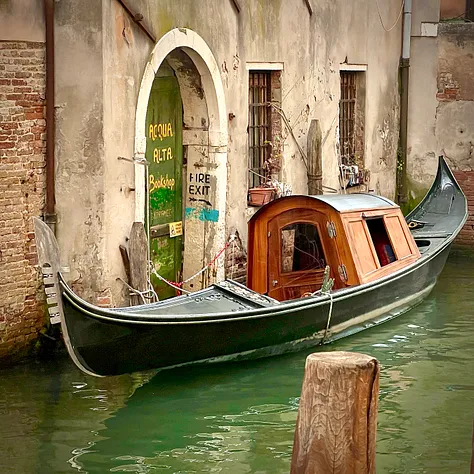Our literary pilgrimage took us next to the Libreria Acqua Alta, a name that translates to "High Water Bookshop." It’s famous for good reason, inside are teetering stacks of books stored in bathtubs, gondolas, and rowing boats to protect them from Venice’s seasonal floods. They even have another gondola outside the back door that opens onto a canal. It’s the official fire escape, they say, with a sign to prove it.