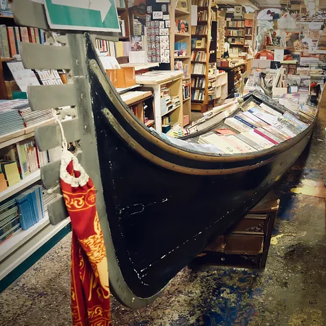 Founded by Luigi Frizzo in the early 2000s, Acqua Alta has become one of the most photographed and beloved bookstores in the world. What began as a quirky idea to safeguard books from the acqua alta — Venice’s increasingly frequent flooding — has grown into a symbol of creative resistance. The shop doesn’t just store books; it absorbs the water, the tourists, the cats, and the slow crumble of the city, with humour and defiance.