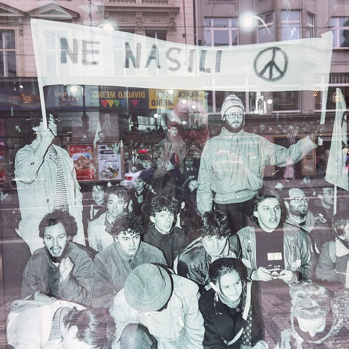 Eventually, hunger got the better of us, and we made our way back down. Back in the centre, we passed a photo exhibition by Tomki Nemec displayed in the windows of a concrete office-style building, black-and-white images of protests, banners reading NE NÁSILÍ (“No to Violence”), mixed with CND signs. A silent echo of the resistance movements that once filled these streets.