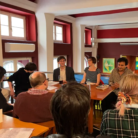 This leg of the Book Trek was rich with literary encounters. I visited The Globe Bookshop and met its American owner, Michael. We had exchanged emails in advance, so he was keen to receive two signed copies of Salt & Seeds — one for himself and one for the shelves. We spoke for an hour about publishing, sustainability, geopolitics, and the literary scene in Central Europe. Michael invited me to the Globe’s own Writers’ Group that evening, and I was honoured to join.