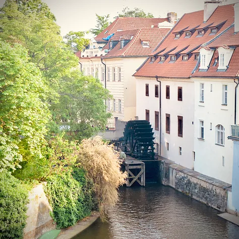 When we reached the centre, we began with a directionless wander, stopping to marvel at the buildings that seemed stitched together from centuries of stories. We found the iconic Charles Bridge, lined with life-sized statues of saints, each burnished by wind, rain, and reverence. Below us, the Vltava River moved slowly, the colour of old pewter. It was good to see a working water wheel; it’s a technology we should revisit.