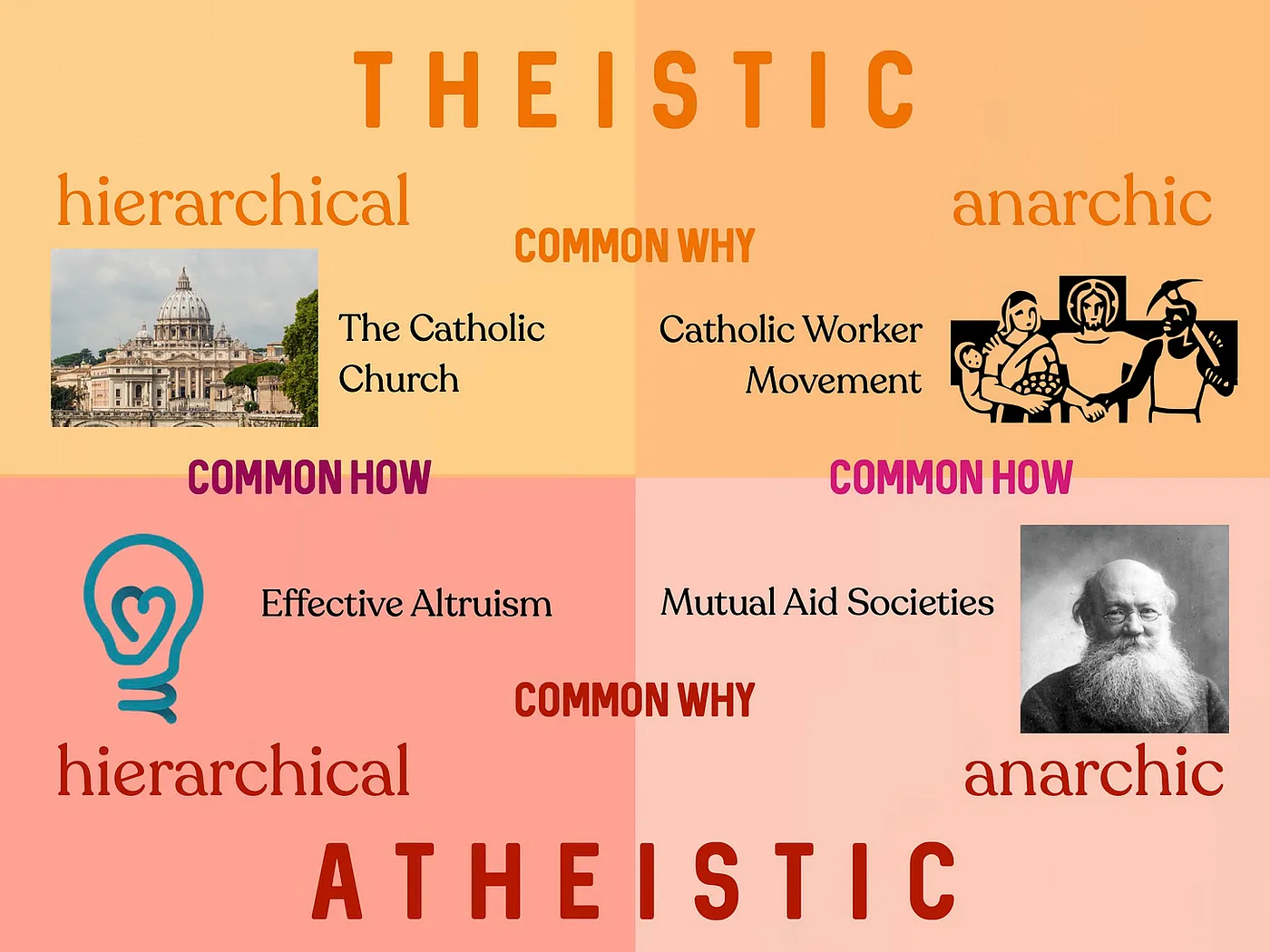 The bottom half features the Effective Altruism organization and the Mutual Aid movement, both of which are founded on ATHEISTIC philosophical perspectives.