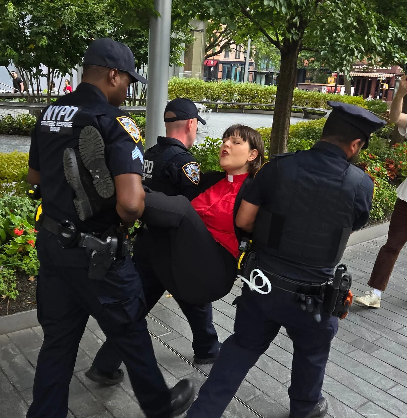 Nevertheless, I felt drawn to participate in this action precisely because it’s rooted in faith. Like several other actions of its kind this summer, this was a demonstration of clergy and lay faith leaders from various traditions, obstructing the entrance to CitiBank, the largest new investor in fossil fuels since the Paris Climate Accords. It was led by my friend the Rev. Chelsea Mac, among others.